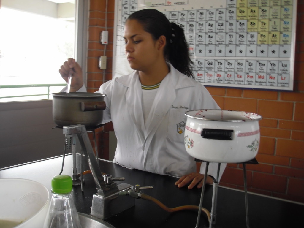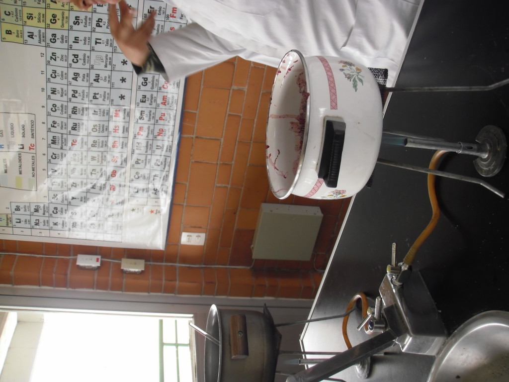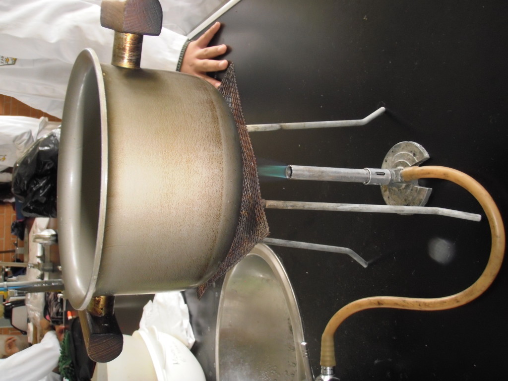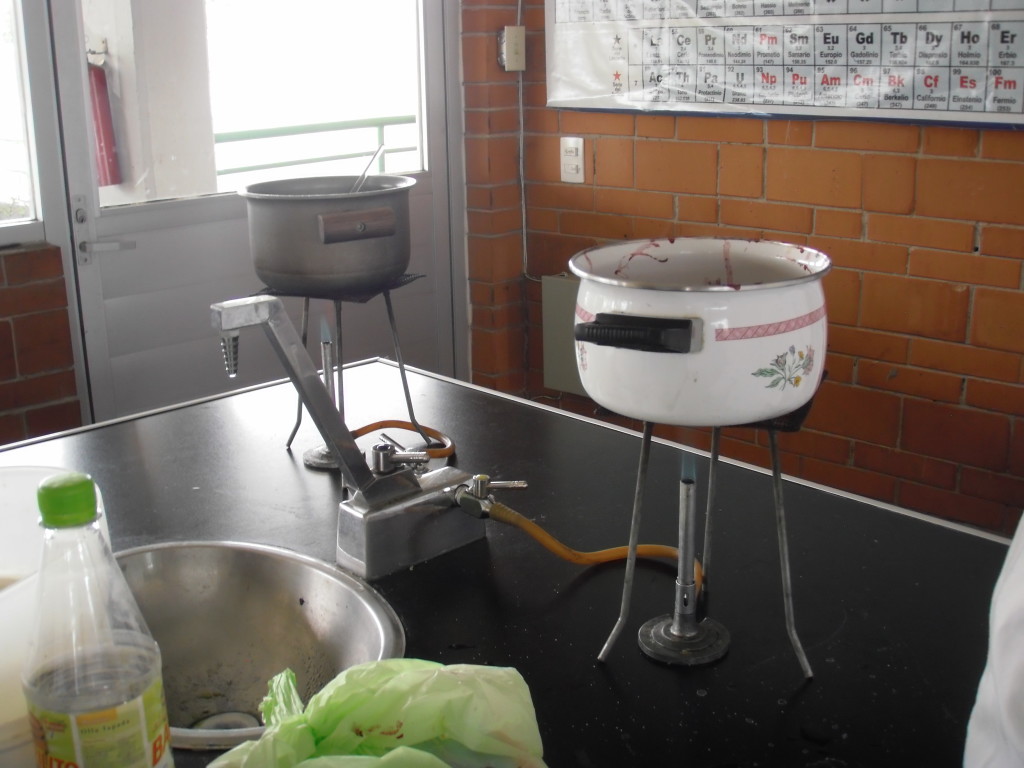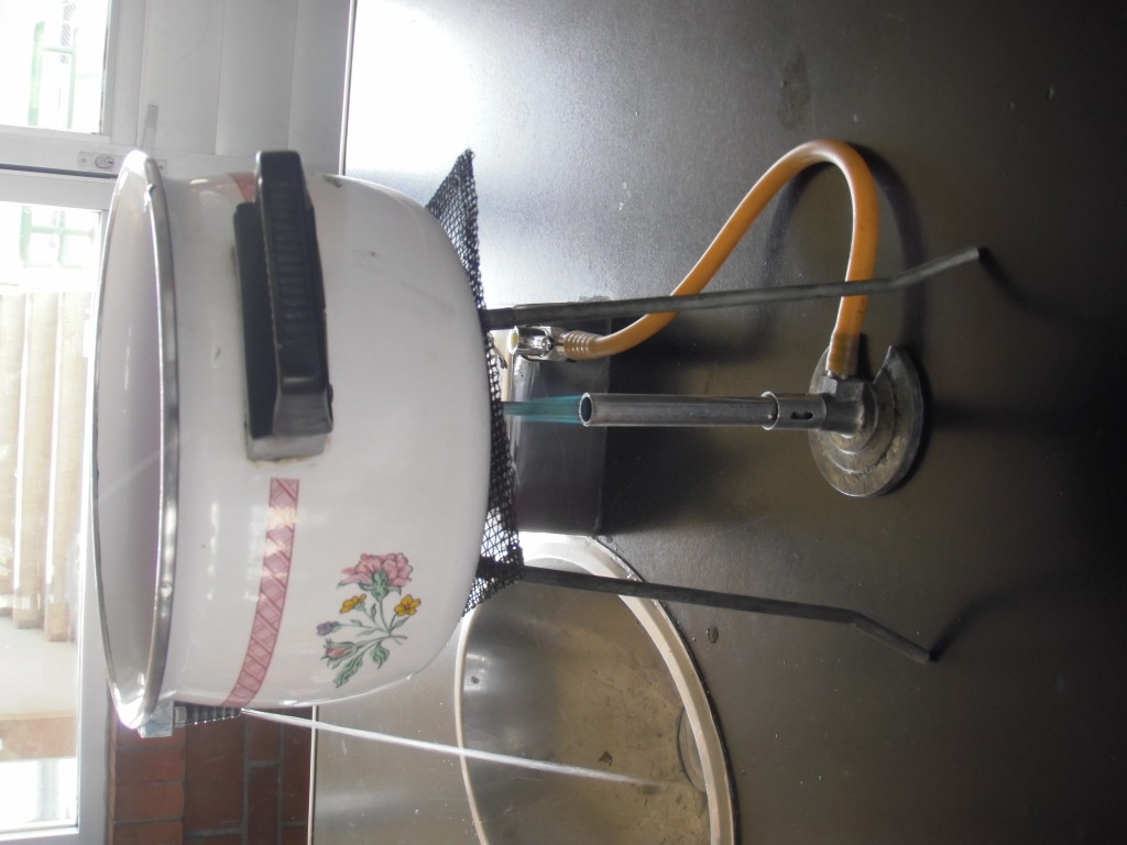 - Colocar sobre el tripie la tela de alambre y la olla, debajo colocar el mechero y encenderlo