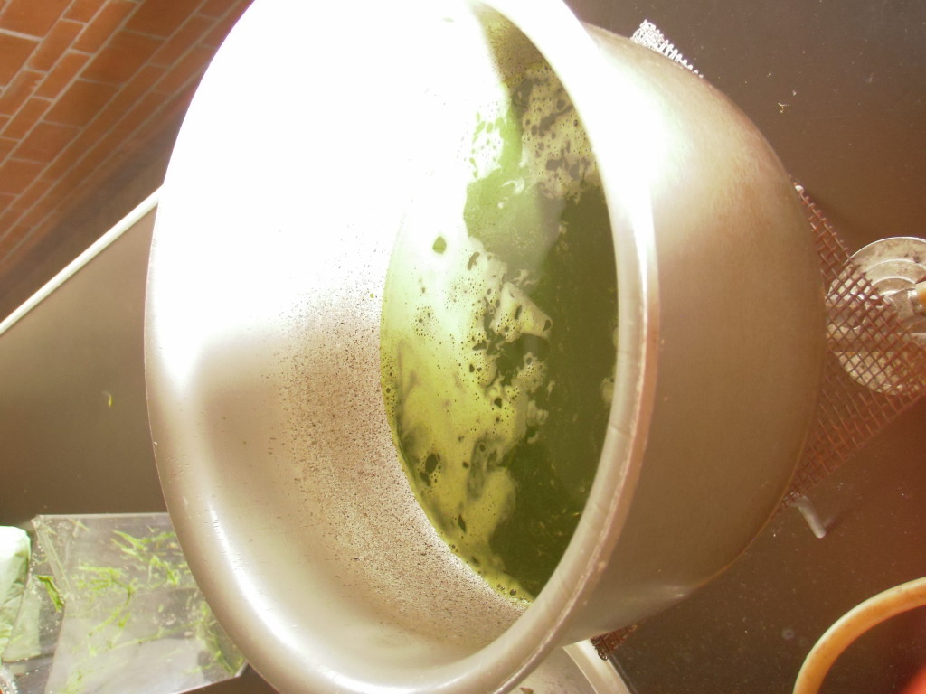 Las Hojas secas para ayudar en la extracción del pigmento se ponen a remojo la noche anterior. Al hervir ver cómo se sueltan los colores las hojas, liquen y corteza de árbol entre muchas.
