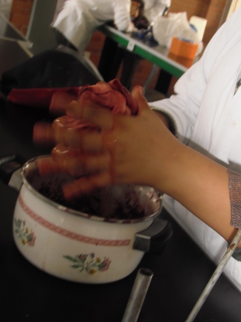 La receta del baño con mordiente: para 100 gramos de lana, 20 gramos de alumbre y 5 litros de agua. Calentar hasta 90° C y mantenerlo así una hora. Después se puede dejar la lana enfriar en la misma olla.