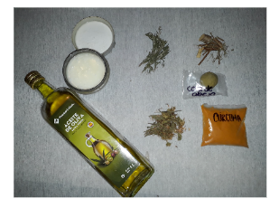 ¿Cómo elaborar un bálsamo cutáneo a base de aceite de coco, cera de abeja, cúrcuma, romero, sauce y árnica para auxiliar en el alivio de inflamación por golpes leves?