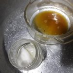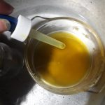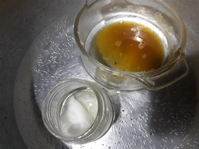 2. Colocar en la cacerola a baño maría los 50 gr. de aceite de coco, poner a fuego lento y mezclar hasta derretir. (Figura 13).