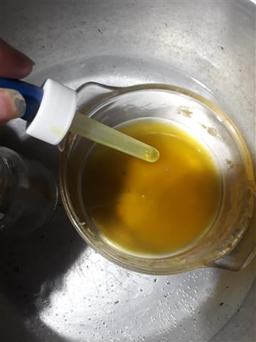 4. Retirar del fuego, añadir 5 gotas de aceite de cúrcuma, 6 gotas de aceite de romero, 5 gotas de aceite de sauce y 8 gotas de aceite de árnica. (Figura 15).