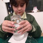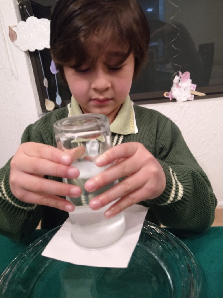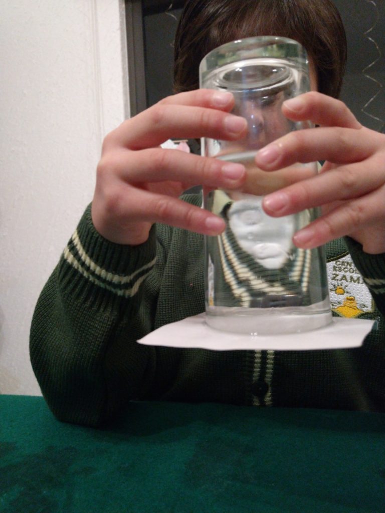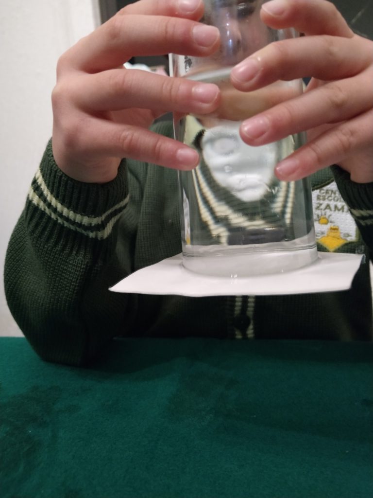 Una vez realizados los pasos del experimento, tal y como aparecen señalados, observe que el pedazo de papel quedo sujeto al vaso y el agua no se cayó del vaso, comprobando con ello, que en mi experimento está presente el aire tanto fuera del vaso o recipiente como dentro de él, y ambos realizan fuerza, pero, el aire que hay afuera es más fuerte, y, por ello, se consigue que el pedazo de papel quede pegado al vaso, y  así el agua no puede caerse, ya que el pedazo de papel no deja que salga el agua. Esto quiere decir, que la presión atmosférica es mayor y empuja el pedazo de papel hacia arriba impidiendo que el agua se caiga y soportando el peso del agua. En términos científicos, podemos decir que este suceso es debido a la presión atmosférica y sin la presencia de esta no sería posible.