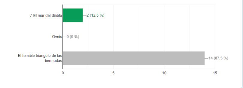En esta pregunta podemos encontrar que casi todos los alumnos piensan que El temible triángulo de las bermudas aunque esto no es del todo cierto ya que el nombre con el que se refieren al Triángulo de las Bermudas es el mar del diablo.