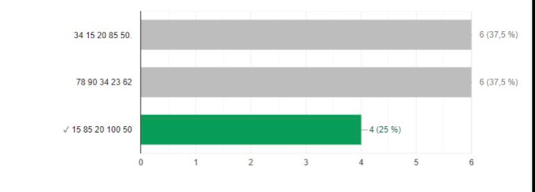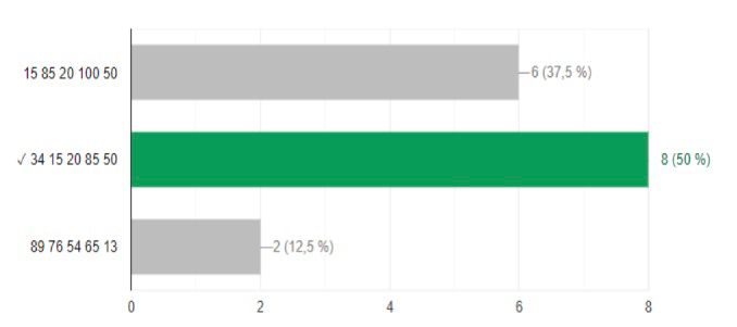 En esta pregunta podemos observar que las respuestas están variadas ya que dos preguntas son las que piensan que son las correctas aunque lo que verdaderamente es correcto es la ultima respuesta ques “15 85 20 100 50”.