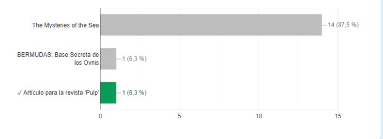 En esta pregunta podemos observar que 14 personas piensan que el primer libro relacionado con el Triángulo de las Bermudas fue The Mysteries of the Sea aunque esto es totalmente falso ya que esto es un mito no un libro lo que es real es el artículo para la revista ‘Pulp’.
