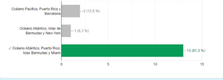 En esta pregunta observamos que la mayoría de las personas piensa que el Triángulo de las Bermudas se ubica en el Océano Atlántico, Puerto Rico, Islas Bermudas y Miami, lo cual es correcto.