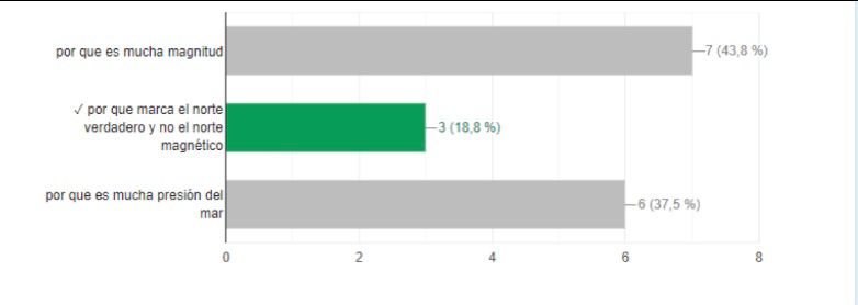 Aquí se observa como la mayoría de mis compañeros piensa que las brújulas se estropean gracias a la magnitud lo cual es falso ya que al estar a una determinada distancia la brújula marca el norte verdadero y no el magnético.