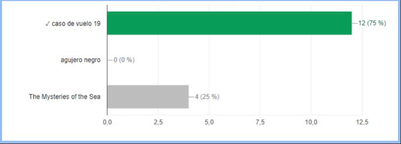 En esta pregunta podemos observar que la mayoría de las personas piensa que la teoría verdadera es la de caso de vuelo 19 lo cual es cierto.