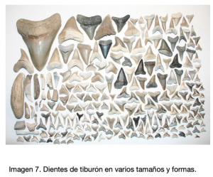 Otro proceso evolutivo que se vinculan con su alimentación y habilidad para la caza, es el hecho de haber desarrollado múltiples hileras de largos dientes (ver Imagen 7) superiores e inferiores, muy afilados y con anchuras variables. Los dientes de los tiburones tienen características (forma, tamaño y número de hileras) y funciones especiales de acuerdo a la familia de escualo que se trate y a su fuente de alimentación, esto se ha convertido en una herramienta para poder identificarlos y clasificarlos.