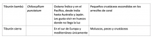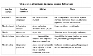 Ahora bien, es cierto que dentro de todas las especies de tiburones que existen en la actualidad sería casi imposible definir una dieta general, por tal razón se realizó la siguiente tabla en la cual se especifican las fuentes de alimento de algunas especies.