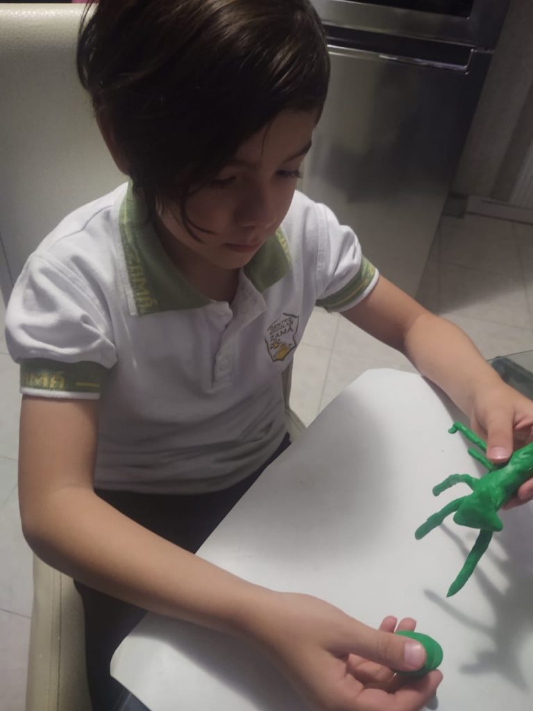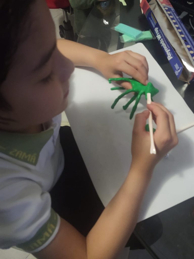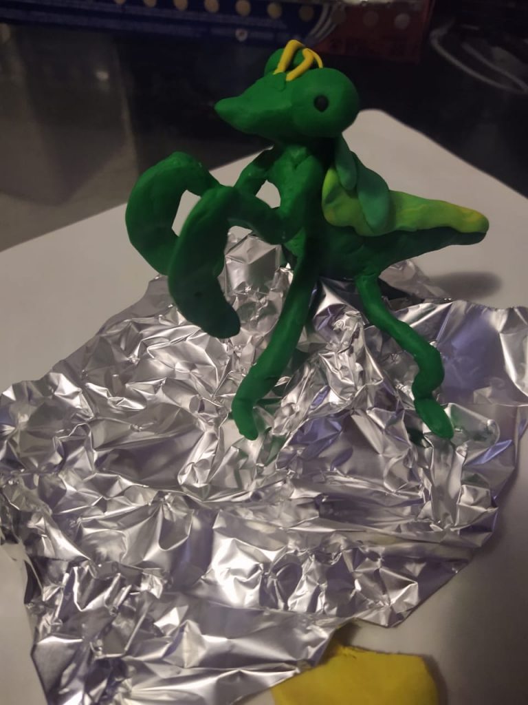 Pude fabricar una figura hecha con arcilla de una mantis donde pude mostrar algunas de sus características como el que tienen dos pares de alas y cinco ojos ya que es un insecto muy complejo.