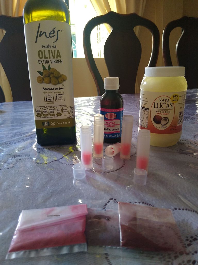 En un contenedor se vierten 3 cucharadas de aceite de coco, 2 cucharadas de aceite de olivo y 1 cucharada de miel en un recipiente y se ponen a baño maria, hasta que se derritan, se agregan de 5 a 10 gotitas de saborizante artificial y un poco de colorante, se mezcla bien y se deja enfriar por unos minutos. Se vierte el contenido en un frasco o en tuvos para bálsamo y se dejan en el refrigerador por unas horas hasta que queden solidificados. Y están listos para usarse.