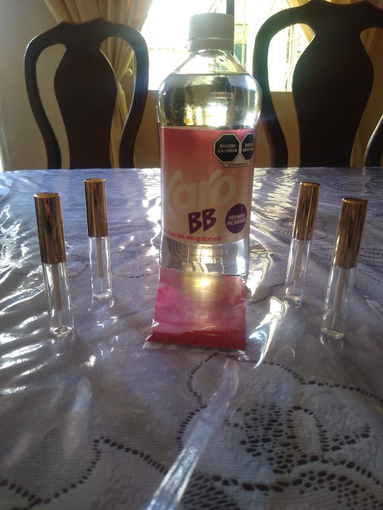 En un recipiente agregamos 200 ml de miel karo, 50 ml de agua y un poco de colorante, se mezclan todos los ingredientes, se vierte el contenido en frascos para brillo y esta listo para utilizarse.