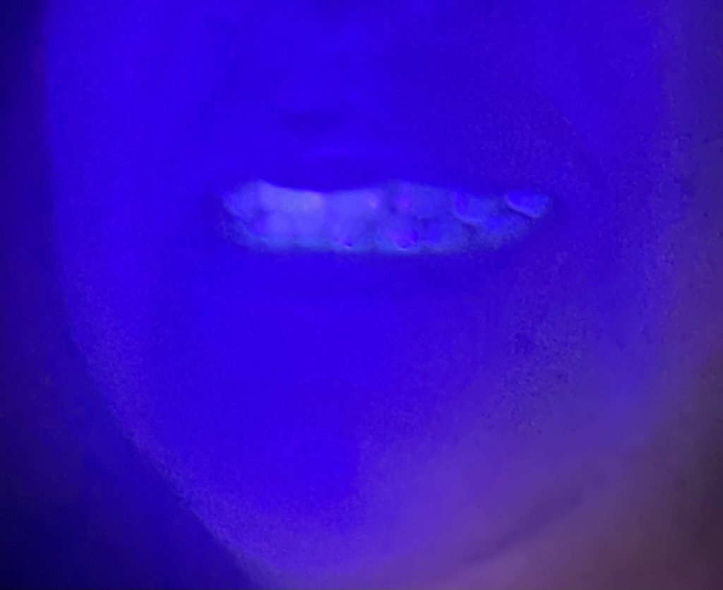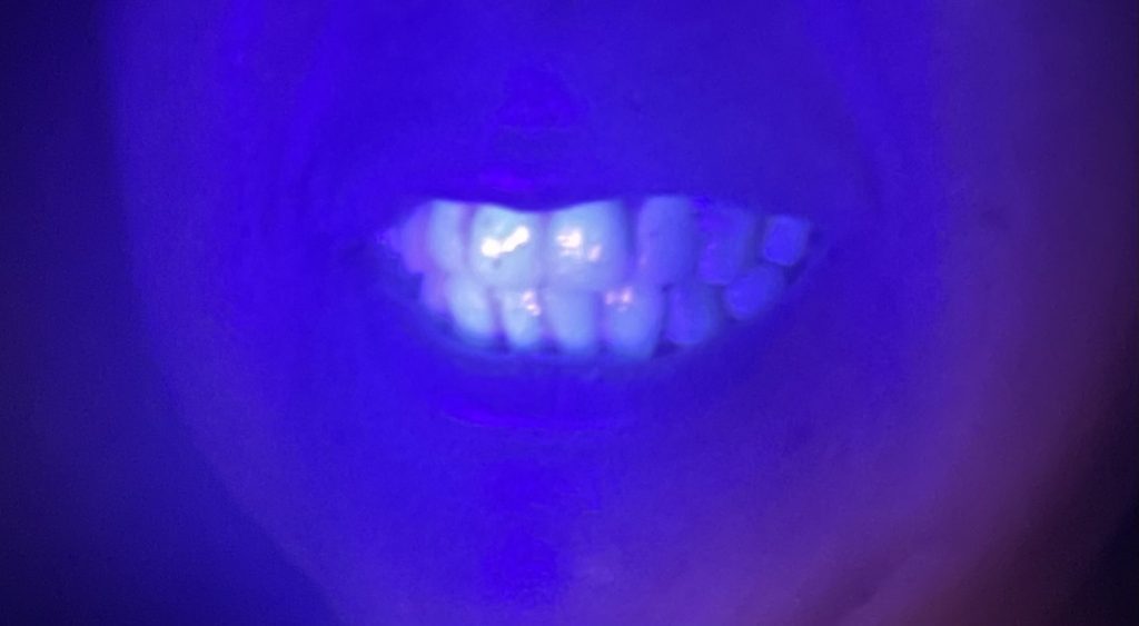 La quinina es un alcaloide que se extrae de la corteza de un árbol llamado Quina, y esta sustancia brilla bajo la luz UV debido a que el sulfato de quinina es luminiscente. Y en las siguientes imágenes podemos observar como usando la luz UV los dientes se ven brillantes.