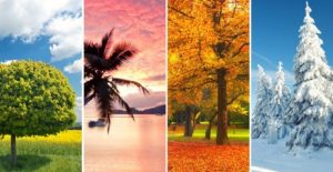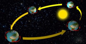 La sucesión de las estaciones del año; la energía del Sol calienta la superficie del planeta con diferente intensidad, dependiendo de la inclinación del eje terrestre.