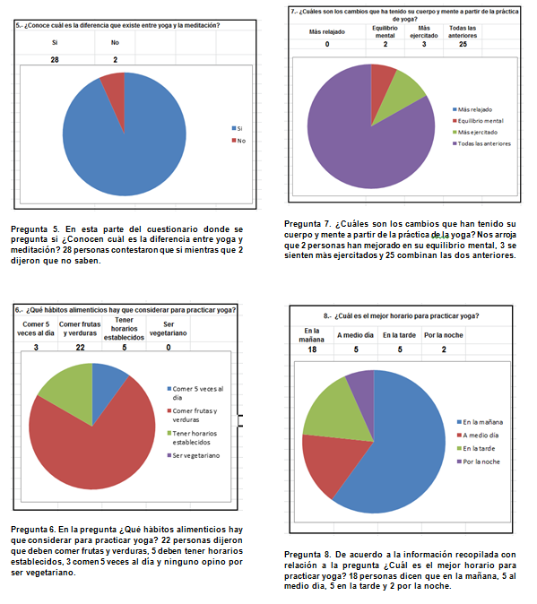 De acuerdo con los datos obtenidos de las 30 personas encuestadas nos indica que el 50% práctica yoga desde hace más de 6 meses en un horario preferentemente matutino con un aproximado de 5 horas a la semana donde gracias a este trabajo se ha fortalecido su cuerpo y mente, además han visto mejores beneficios una vez que se complementa la actividad con una alimentación basada en frutas y verduras, de tal manera que la yoga puede realizarse desde una edad temprana hasta la adultez pues las ventajas se ven reflejadas a corto plazo.