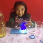 El aceite se mantiene encima del agua porque es menos denso que ella. Por otra parte, el agua y el aceite no se mezclan debido a la llamada “polaridad intermolecular esto es, cada sustancia tiene una polaridad molecular que hace que se atraiga con otras moléculas de su misma “especie”, pero el agua y el aceite son “especies “completamente opuestas por lo que, en vez de atraerse, se repelen. Esto también explica por qué las gotas de colorante alimentario se mezclan con el agua y no con el aceite: son de la misma “especie”. Cuando añadimos las pastillas efervescentes, éstas empiezan a disolverse creando un gas. Este gas forma burbujas que, al subir, llevan con ellas un poco de colorante. Cuando estas burbujas llegan al borde de la botella, dejan escapar el gas y el agua vuelve abajo, volviendo a comenzar el proceso.