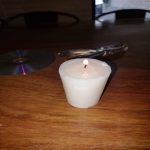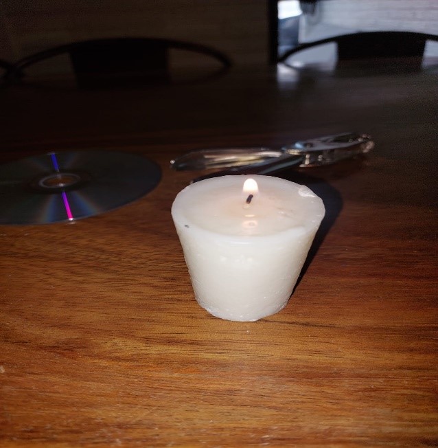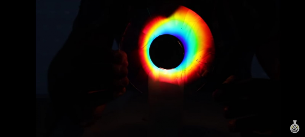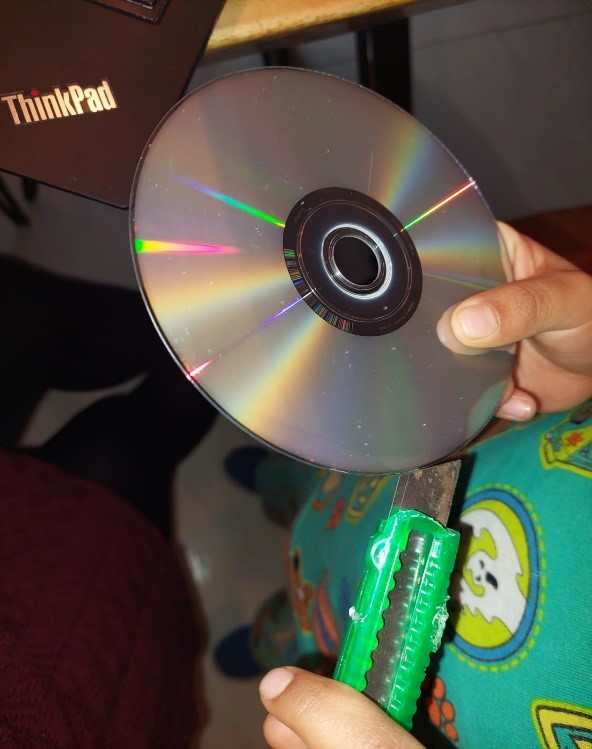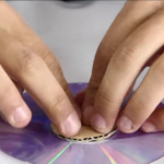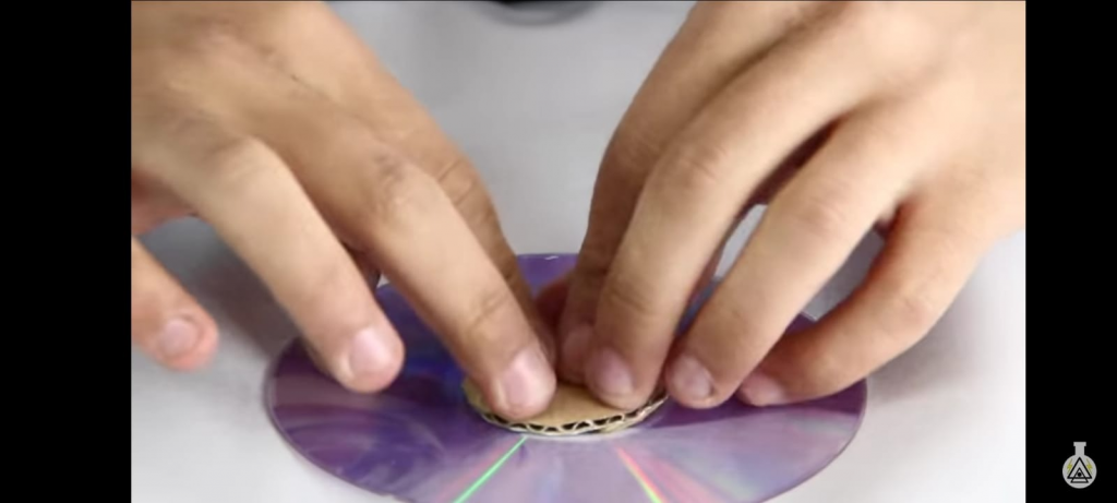 Tomamos el Cd y con el cúter quitamos una cara del Cd vamos introduciendo el cúter con mucho cuidado y lo vamos separando, después cortamos un pedazo de cartón del tamaño del círculo de en medio del CD y lo pegamos en medio con cinta adhesiva, ahora con la pinza agarramos el CD de una esquina, encendemos la vela y apagamos las luces, ahora acercamos el CD  a la vela y podremos ver como se forma un arcoíris también puedes utilizar la lampara de un celular en lugar de una vela.