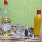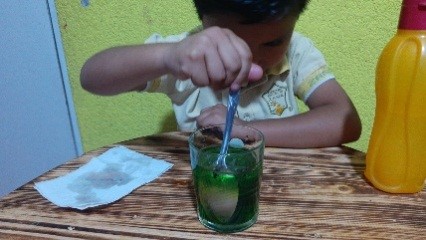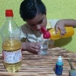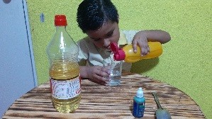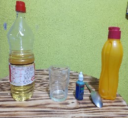 1.- Reunir los  siguientes materiales: Aceite de cocina, un vaso, color vegetal, agua y una cuchara.