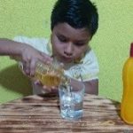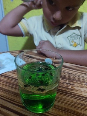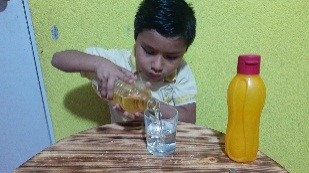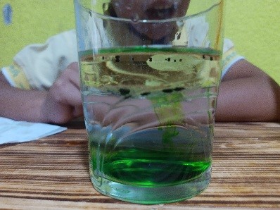 3.-  Posteriormente agregar aceite de cocina, se observa que este se queda en la superficie  del vaso y no se mezcla con el agua por su densidad.