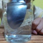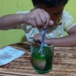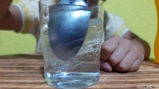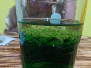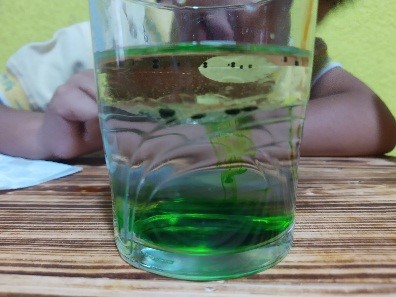 6.- Se revuelve simulando el movimiento de los océanos y se observa que es muy poco el colorante que atraviesa el aceite llegando al fondo, del vaso.