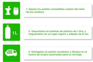 Los ciudadanos debemos separar las grasas y los aceites comestibles usados ya sea de origen animal o vegetal, grasas desmoldantes, aceites de corte, aceites rancios o caducos y los provenientes de trampas de grasa, y depositarlos directamente en contenedores con tapa debidamente cerrados.