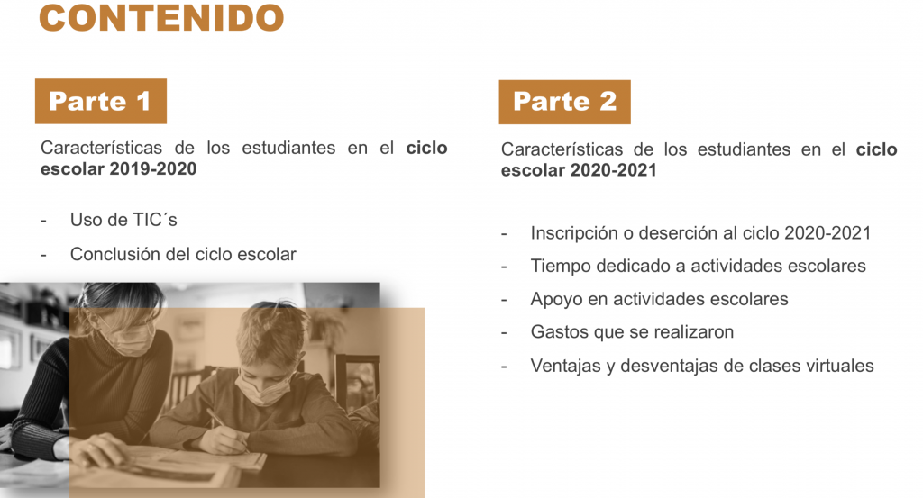 La ECOVID-ED 2020 permite conocer el impacto por la cancelación provisional de clases presenciales en las instituciones educativas del país, en la experiencia educativa de niños, niñas, adolescentes y jóvenes de 3 a 29 años, tanto en el pasado ciclo escolar 2019- 2020, como en el actual ciclo 2020- 2021.