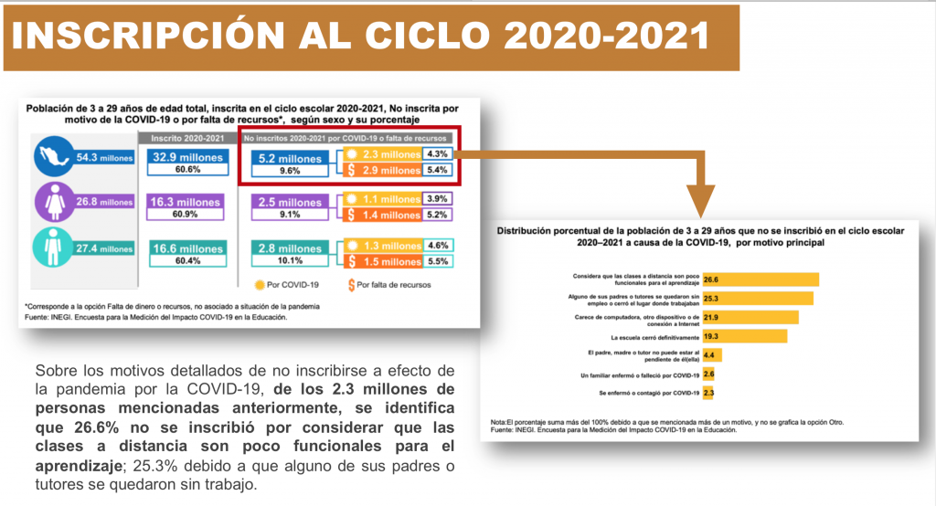 La ECOVID-ED buscó distinguir cuando el motivo de la no conclusión de un ciclo escolar o el no continuar dentro del sistema educativo estuvo relacionado con los efectos adversos que en distintos ámbitos de la vida social y económica ha ocasionado la COVID-19.