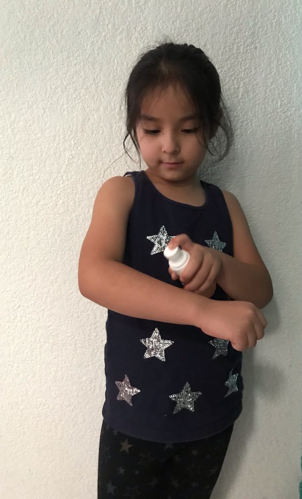 Si lo vas a aplicar en tus brazos o piernas lo puedes rociar directamente con el atomizador y luego con tus manos lo esparces un poco si es necesario.