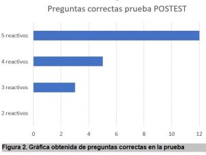 En la evaluación pretest que se muestra en la figura 1, el 20% de los participantes obtuvieron 2 reactivos correctos; el 30% obtuvo 3 reactivos correctos; el 35% obtuvo 4 reactivos correctos y el 15% obtuvo todos los reactivos correctos.