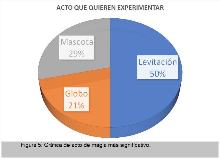 Al plantear la pregunta de cuál fue el acto que más les gustó los resultados se pueden observar en la figura 4: El 42% de los participantes que contestó el reactivo expresó su interés en que todos fueron de su agrado, el 33% prefirió el truco del globo; el 17% mencionó que les gustó el truco de levitación y el 8% prefirió el de la mascota.