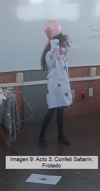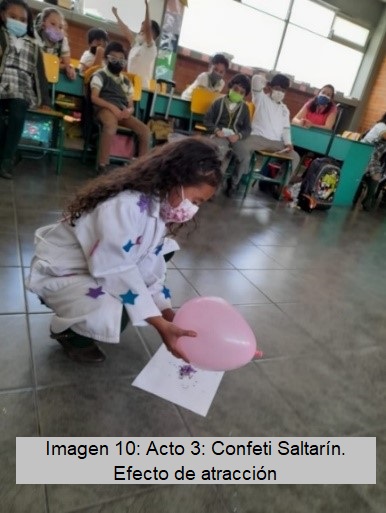El globo al tener carga negativa cuando se acerca al confeti de papel de alta carga positiva, genera una reacción física de atracción, lo que permite observar cómo los fragmentos de confeti se pegan al globo y parece que brincan (imagen 10).