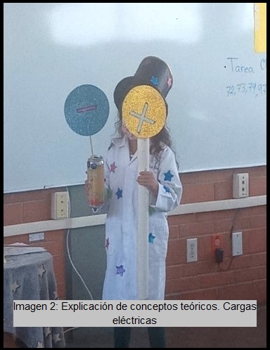 Al termino de los actos, se dedicó un espacio de tiempo para divulgar al público los conceptos teóricos de electroestática (imagen 2), el comportamiento de las cargas eléctricas y sus efectos electroestáticos de atracción o repulsión que se generan entre los cuerpos (imagen 3).