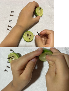 4- Con ayuda de un adulto corta por la mitad el limón. En cada mitad de limón pon los clavos de olor de manera que no se caigan